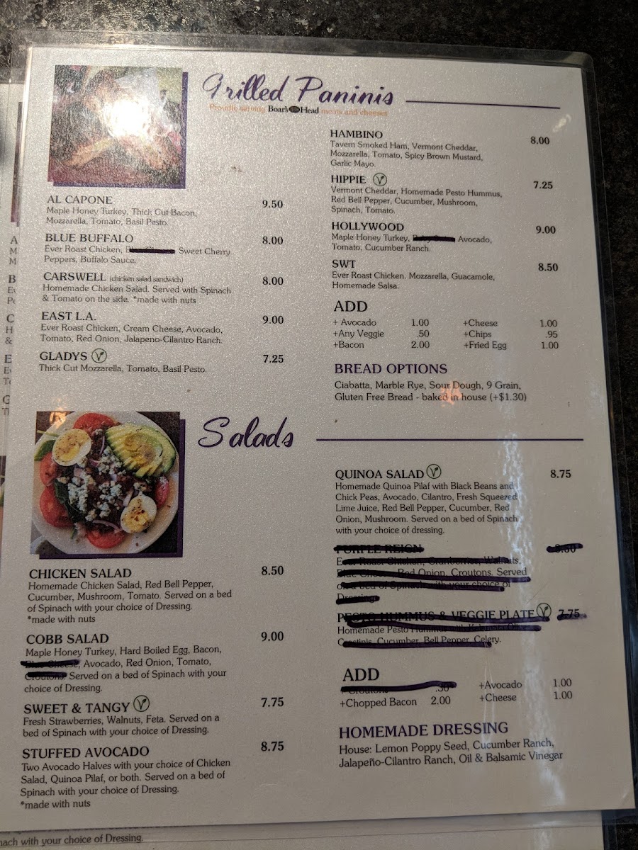 Two avocado halves stuffed with your choice of chicken salad, quinoa pilaf or both over a bed of greens with choice of homemade dressing