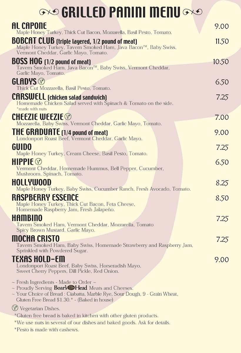 Our menu is a delightful mix of handcrafted sandwiches, refreshing smoothies, and indulgent Java Chinos. Treat yourself to the Hambino sandwich, layered with smoked ham and creamy cheeses, or savor our all-time favorite Cheezie Weezie, a double cheese delight. For those seeking a sweet escape, our Mocha Java Chino and Pumpkin Spice Java Chino are truly irresistible, topped with fluffy whipped cream.